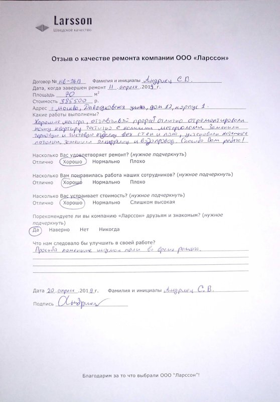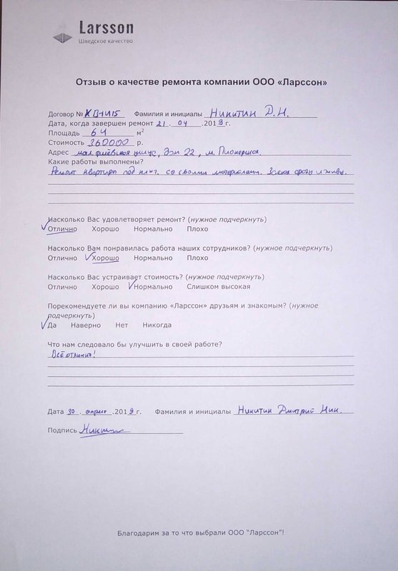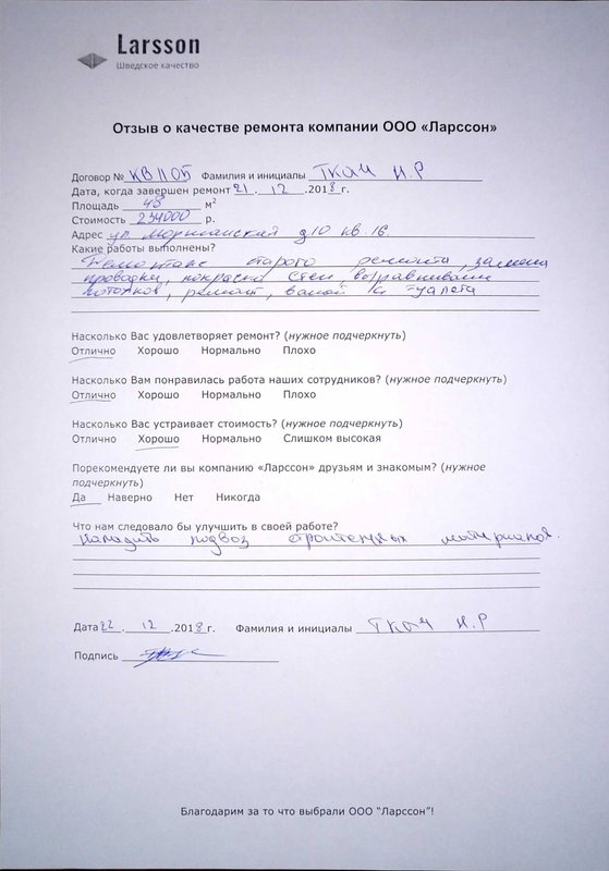 Преимущества: Компания Larsson делала у меня капитальный ремонт, вторичное жилье, по черновым работам хотел звукоизоляцию, поменять проводку, канализацию, потому что старые были уже вообше не ахти. Теплые полы в ванной заказал, навесные потолки сделал, остальное по мелочи. По чистовым работам положили ламинат, покрасили стены, в ванной положили плиту. Материалами всеми занималась компания, я посмотрел на них и в принципе и по ценам и по качеству мне они понравились и я уже полностью положился на них, к тому же все было понятно и доступно проиллюстрировано в смете на материалы, которую составил прораб Николай, он же отвечал за ремонт, держал меня в курсу происходящего, высылал фотоотчет выполненных ремонтных работ и по всем вопросам всегда отвечал. Смету на работу я получил бесплатно, заказал замер и в удобный мне день приехал инженер сметчик Степан и рассчитал развернутую смету, мне все было понятно, условия работы компании, цены, сроки, так что я еще пару дней тайм аута взял, а потом уже обратился за оформлением договора и началом работ. Ремонт был под ключ, я выселился на время ремонта, но мастера все славяне и проживают в Москве, так что на моей квартире они только приезжали, работали и уезжали. Предоплаты не было, платил по факту выполненных работ поэтапно , то есть уже видел готовый результат. Предоставляется гарантия по договору до 3 лет, лучше пусть не пригодится, но хорошо, что она есть вообще. Все детали закреплены в договоре, в том числе и смета, и она в течение ремонта не менялась и осталась той же, что была при замере, потому что все изначально инженер сметчик посчитал правильно. Ремонт понравился, качество работ хорошее, сделано правильно и аккуратно, цены тоже хорошие, в компании как я понял работают толковые сотрудники, с которыми приятно иметь дело.