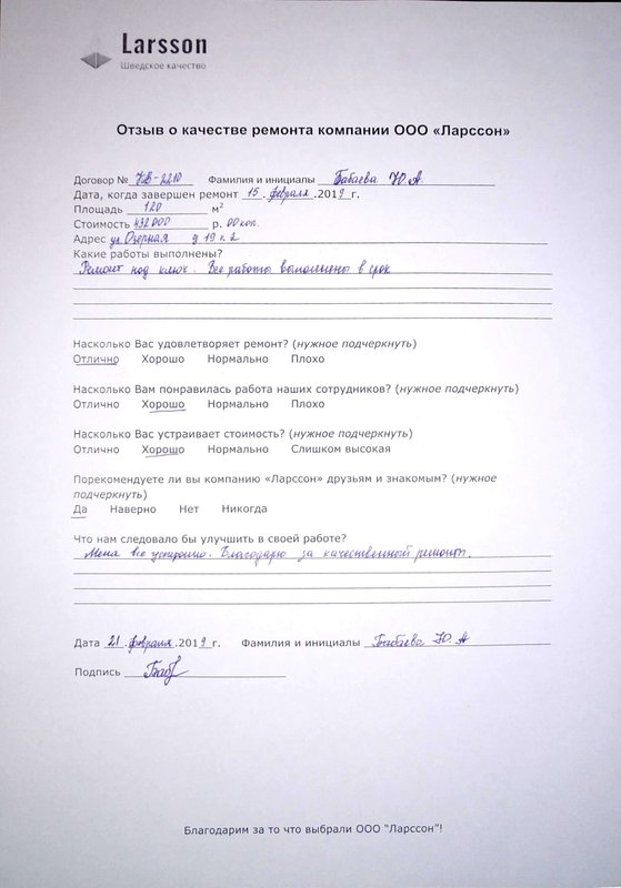 Спасибо Ларсон за качественный и выполненный в срок ремонт! Заказывала у них косметику в моей квартире, ремонту больше 10 лет и нужно было обновить чистовую отделку, заменить напольное покрытие (старому линолеуму я уже не знаю сколько было) на ламинат, обои переклеить на виниловые, чтобы была возможность их мыть (у меня маленькая дочка, так что это реальный вопрос!!)) и заменить розетки и выключатели. В срок вложились, по качеству работ и материалов претензий нет)